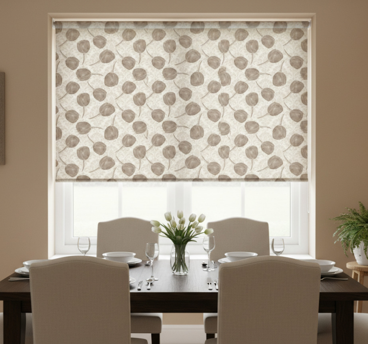Reference: E6615Transform your living space with our Dining room blind in gray tulips and acanthus scrolls. This stunning design features exquisite gray tulips intertwined with elegant acanthus scrolls, creating a sophisticated aesthetic that enhances any dining area. The intricate patterns not only add a touch of luxury but also create a warm and inviting atmosphere, making your dining experience truly special.