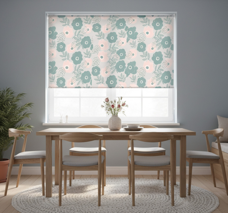 Reference: E6620Transform your living space with our stunning Dining room blind with pink and blue watercolor flowers. This beautiful design features delicate watercolor flowers in shades of pink and blue, bringing a soft and vibrant aesthetic to your dining area. The artistic blend of colors creates a serene atmosphere, while the floral patterns add a touch of elegance and charm to any decor.