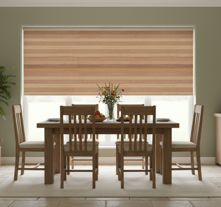 Reference: E6557Transform your living space with our Elegant rustic wood dining room blind, a perfect blend of style and functionality. This charming roller blind features an exquisite wooden design that effortlessly enhances the beauty of your dining room. With easy assembly in just two clicks, it is also incredibly easy to clean and disassemble, making maintenance a breeze. The blind protects your room from direct sunlight while providing privacy when lowered, allowing you to enjoy your meals in peace and comfort.