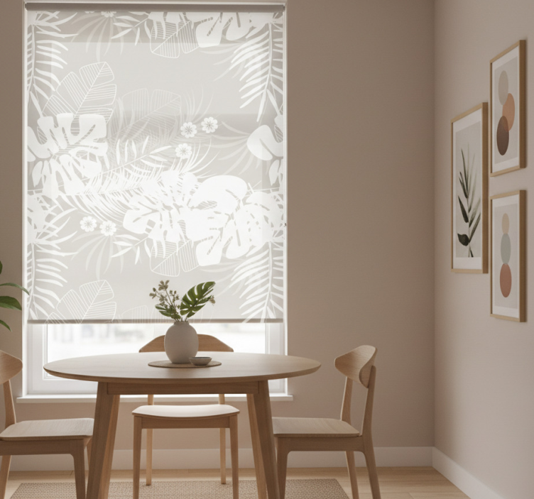 Reference: E6713Transform your living space with our stunning Dining room blind with gray tropical leaves. This beautifully designed roller blind showcases a captivating pattern of gray tropical leaves, perfectly blending elegance and nature. Its unique aesthetic brings a refreshing vibe to any dining area, making it an ideal choice for those looking to elevate their home decor while enjoying the functional benefits of a high-quality window treatment.