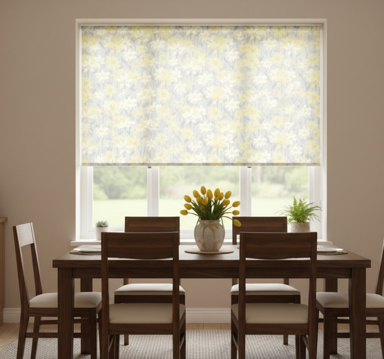 Reference: E6252Transform your space with our Floral yellow blooms dining room blind, featuring vibrant yellow flowers that dance across a soft fabric canvas. The design is not only visually stunning but also practical, offering easy assembly in two clicks, effortless cleaning, and quick disassembly. This roller blind effectively protects your room from direct sunlight while ensuring privacy when lowered. Regulate your room temperature with ease and enjoy the security of your home, allowing you to see outside without being seen. With customizable measurements and a choice of three textures, this blind is the perfect addition to elevate your decor!