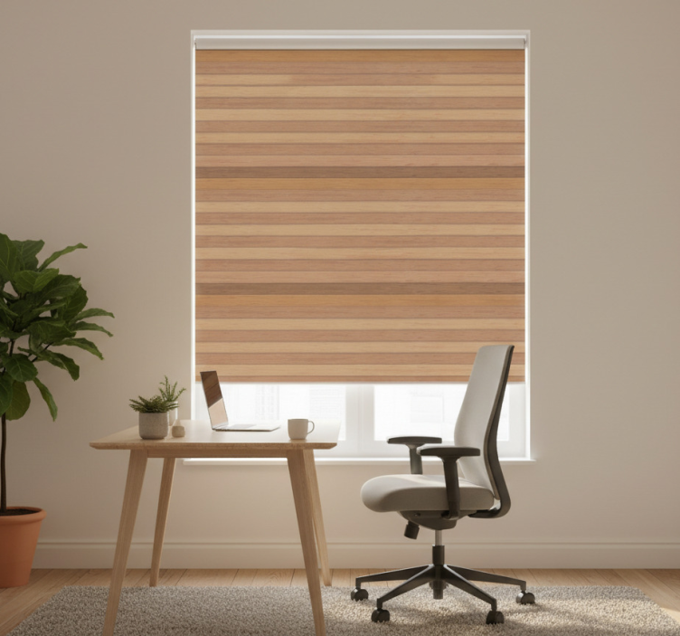 Reference: E6200Transform your workspace with our Home office blind with elegant rustic wood design, a stunning blend of style and functionality! This roller blind features an exquisite rustic wood design that adds warmth and charm to any home office. With easy assembly in just 2 clicks, effortless cleaning, and a user-friendly chain mechanism for raising and lowering, it’s the perfect choice for your decor. This blind not only enhances the aesthetic appeal of your room but also effectively protects against direct sunlight while providing privacy when lowered.