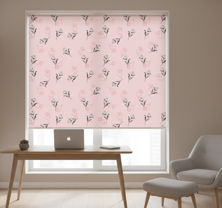 Home office blind with white lilies on pink