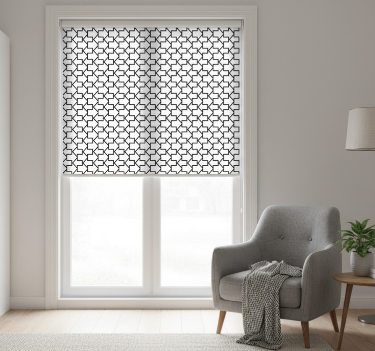 Reference: E7650Introducing the Modern blind geometric arrows black lines pattern, a stunning design that elegantly combines contemporary aesthetics with functional versatility. This unique roller blind features a striking geometric arrow pattern in black lines that adds a bold statement to any room. Crafted for easy assembly and disassembly in just two clicks, it ensures hassle-free cleaning and maintenance. Not only does it protect your space from direct sunlight, but it also provides privacy when lowered, allowing you to enjoy your environment in comfort and style!