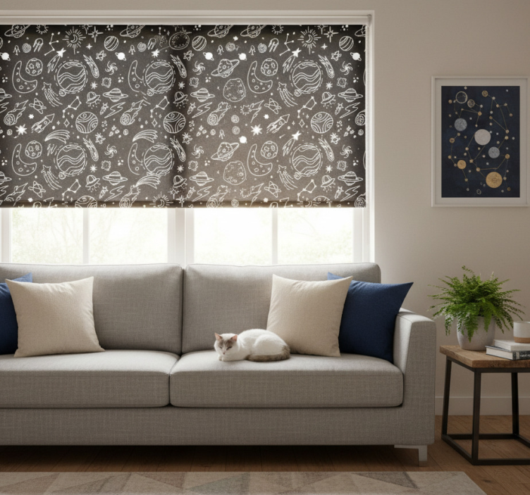 Reference: E7748Transform your space with our Modern blind with black and white cosmic art. This stunning design features a captivating cosmic pattern that beautifully blends black and white hues, creating a unique visual experience. The intricate artwork not only enhances the aesthetic appeal of any room but also ensures that your windows are adorned with a touch of celestial wonder. Enjoy the benefits of easy assembly in just 2 clicks, effortless cleaning, and the ability to regulate your room's temperature while providing privacy when lowered!