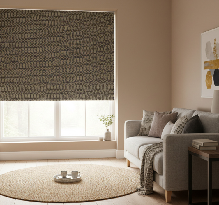 The Modern blind with gold and gray hexagon pattern modern blind is the perfect choice for those looking to infuse their space with style and sophistication! This contemporary blind not only improves the aesthetic of your room but also provides the practicality of protecting your interiors from direct sunlight. Imagine a beautifully decorated room that still feels inviting and warm, thanks to the perfect balance of light management and design.