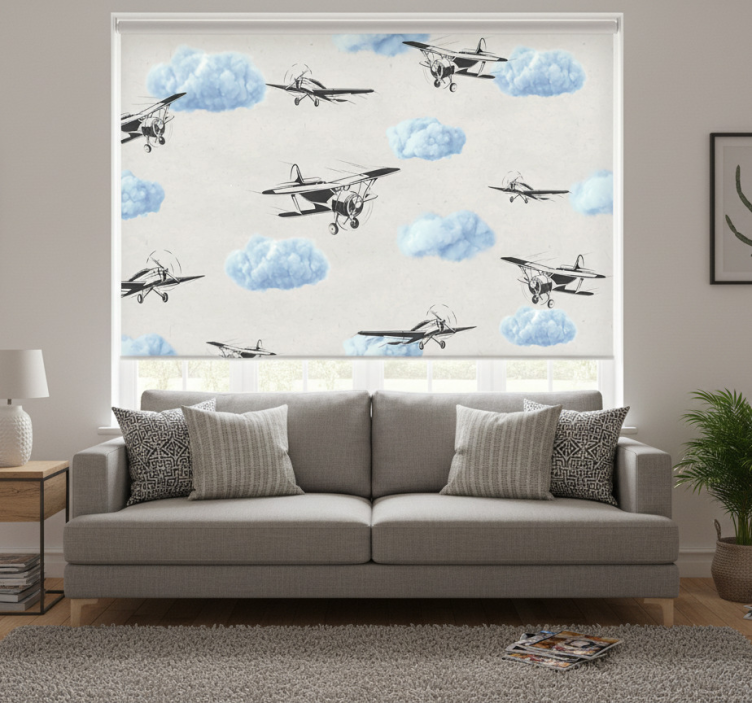 Reference: E8460Transform your space with our White window blind airplanes in the sky design! This stunning roller blind features a unique sky-themed graphic, beautifully depicting fluffy white airplanes soaring through a serene blue backdrop. The design not only captures the imagination but also enhances any room's aesthetic with its playful yet elegant charm.