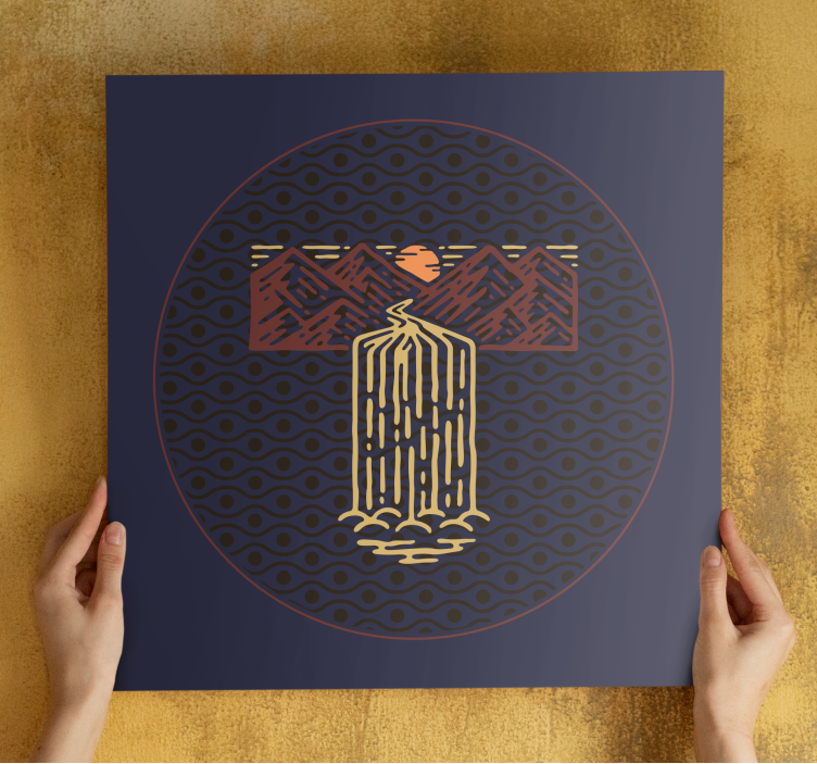 Immerse yourself in the tranquil beauty of nature with our Landscape canvas serene waterfall scene. This stunning design showcases a breathtaking waterfall cascading down majestic mountains, bathed in the warm glow of a vibrant sunset. The artwork features a harmonious blend of purple tones and geometric patterns, creating a minimalist drawing that captures the essence of African landscapes. The abstract representation of mountains and the round circle of the sun come together to evoke a sense of peace and serenity, making it a perfect centerpiece for any room.