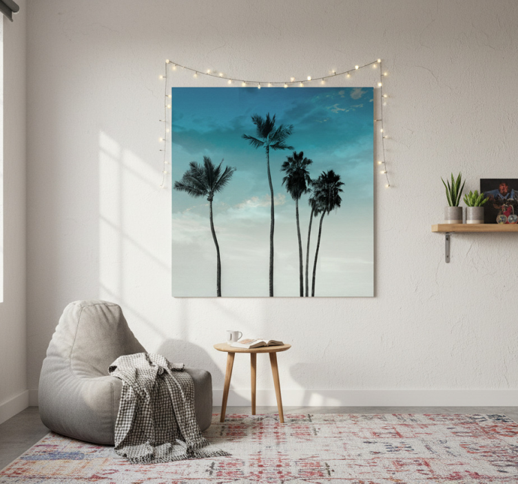 To display your Living room poster with five tall palm trees design wall posters for living room, we recommend using double-sided adhesive tape for a clean look. Simply stick the tape to the back, hold each strip firmly for 10 seconds, and enjoy your artwork! Alternatively, framing the poster adds elegance. You can also use thumbtacks or reusable blu-tack for a versatile approach.