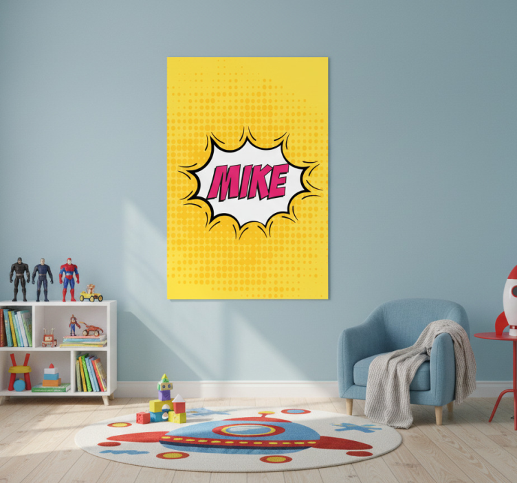 This vibrant image features a bold, comic-style design with the name 'MIKE' prominently displayed in pink lettering. The bright yellow background is adorned with dotted patterns, evoking a playful atmosphere. Ideal for adding a personal touch, this artwork is perfect for children's rooms or playful spaces.