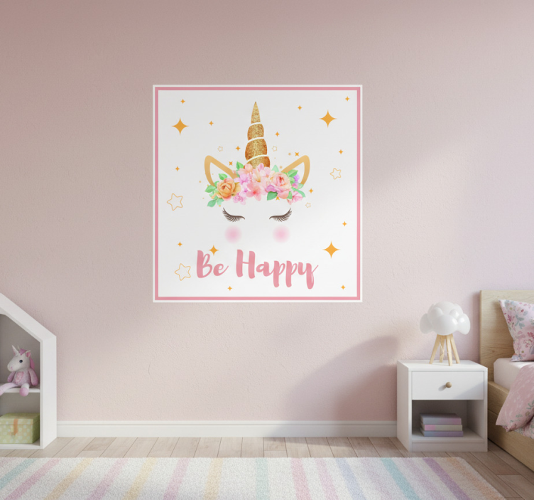 Reference: G902Introducing our enchanting Nursery poster unicorn with phrase be happy, designed to bring joy and positivity to any child's room! This delightful poster features a vibrant unicorn illustration with a whimsical, cheerful aesthetic that captivates the imagination. Crafted with a 180g/m2 grammage for durability, it boasts a semi-matt finish that eliminates reflections, ensuring the high colour intensity shines through beautifully.