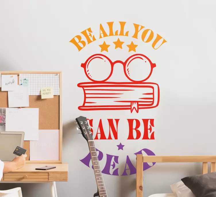 Cool design illustrating a hand drawn book with reading glasses and text. It would make a lovely decoration on any space applied on, it can be applied on wall, door, furniture, laptop, etc.