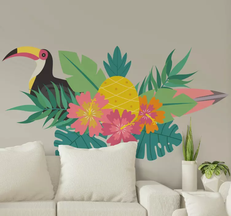 Transform your space with our Animal wall sticker tropical bird design, featuring a stunning array of vibrant colors and lively graphics. This design showcases a beautiful toucan surrounded by lush greenery, tropical leaves, and colorful flowers, creating a whimsical atmosphere that brings a slice of paradise into your home. The playful inclusion of pineapple elements adds a unique touch, making it a perfect choice for those who love nature and vibrant decor!