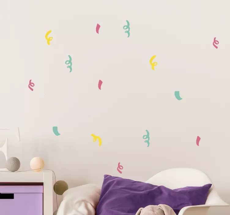 Transform your space with our Colorful curved shapes decoration wall sticker! This vibrant design features playful confetti and twisted shapes that create a modern and decorative atmosphere. The colorful curves bring a sense of joy and whimsy, making it a perfect addition to any room.