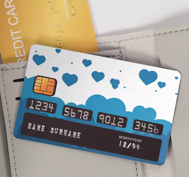 Brighten up your financial life with our Credit card sticker cloud hearts design. This playful sticker features charming hearts floating among fluffy clouds in a beautiful blue hue. Perfect for adding a touch of love to your credit card, this design is not just visually appealing but also a fun way to express your personality!