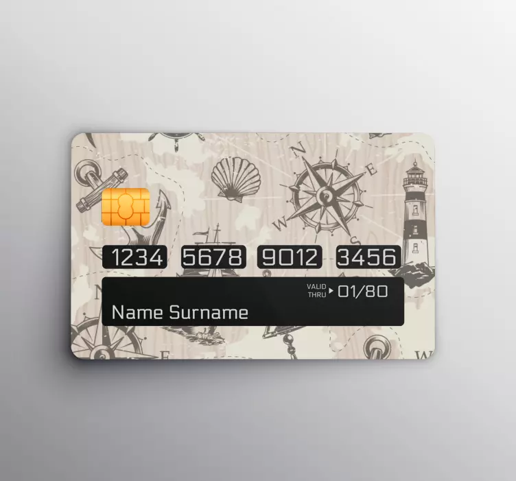 Transform your financial companion with our Credit card sticker nautical themed design! This beautifully crafted sticker features an intricate pattern of anchors, lighthouses, shells, and compasses, all set against a backdrop reminiscent of aged wood and vintage maps. The vibrant illustrations bring a touch of the ocean to your everyday life, making your credit card stand out with a unique nautical flair!