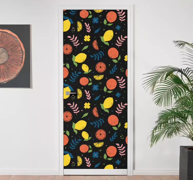 Transform your space with our door sticker with colorful citrus patterns! This vibrant adhesive features stunning illustrations of oranges, lemons, and other fruits against a sleek black background. The floral patterns and bright colors will instantly uplift any door, creating a cheerful atmosphere in your home or office.
