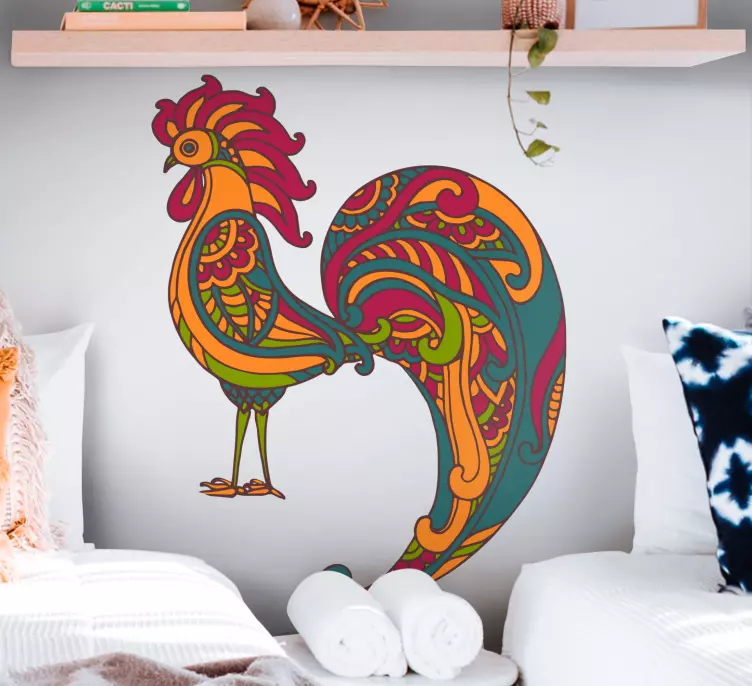 The Farm animal wall sticker colorful rooster design features a stunning and vibrant graphical representation of a rooster, beautifully crafted with ornate details and an ethnical touch. This decorative silhouette brings the essence of farm life into your space, making it a perfect addition for anyone looking to enhance their home with a lively and colorful accent!