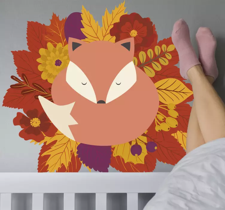 Transform your space with our stunning Farm animal wall sticker fox with leaves. This enchanting design features a sleepy fox nestled among vibrant autumn leaves, capturing the essence of wildlife and nature. The colorful illustration of this wild animal surrounded by flowers embodies the warmth of fall, making it a perfect addition to any room!
