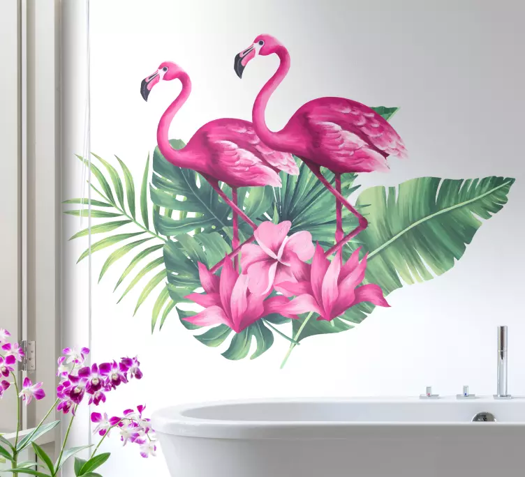 Get this design and enjoy all the different elements that you can use to change the look of your walls. This is more than just a simple decoration. You can fully customise the look of your house without much effort or money. This product is easy to apply. You don't need any kind of special equipment. It comes pre-glued and it is made with great materials for your satisfaction. ThisFlowers and painted plants sticker with flamingos