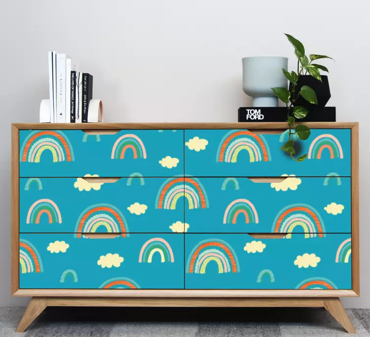 Transform your living space with our Furniture sticker colorful rainbow designs, featuring whimsical rainbows and fluffy clouds that create a playful atmosphere. This vibrant pattern is perfect for adding a splash of color to your furniture, making it a delightful choice for both kids and adults alike!