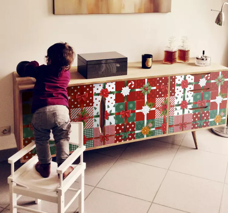 This decorative Christmas gift box furniture decal is sure to bring a smile to your face every time you see it. The intricate design and vibrant colors will brighten up any room and create a warm and welcoming atmosphere.
