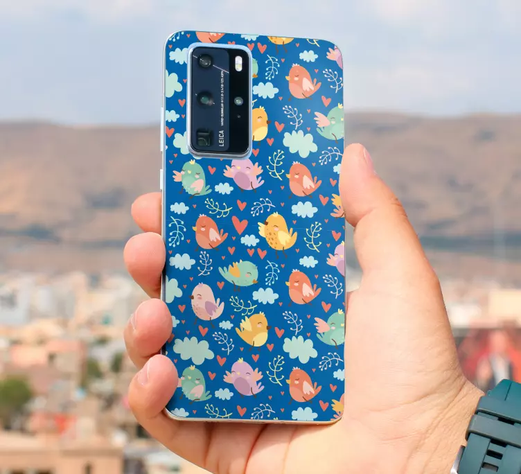 Introducing the Huawei sticker vibrant bird design, a delightful and playful graphic that brings a touch of joy to your space! Featuring charming cartoon birds amidst colorful hearts and fluffy clouds, this design is perfect for those looking to add a splash of color and whimsy to their phone or any flat surface. With its cheerful palette and fun elements, this sticker is sure to brighten your day!