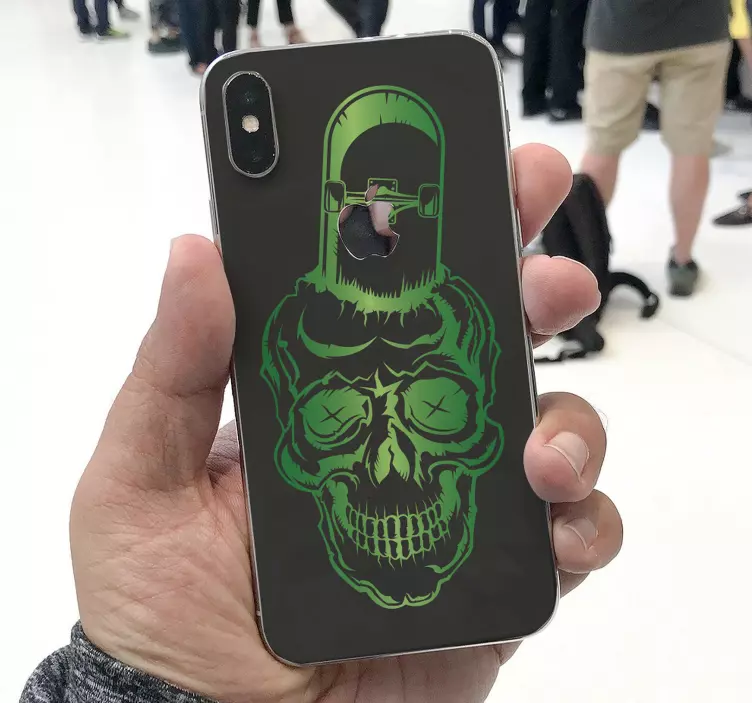 Introducing the Iphone sticker green skull design! This vibrant and edgy design features a unique blend of a skull and a character that brings a playful yet rebellious vibe. Imagine a cool skateboarder vibe, where the green skull design stands out, making your phone a canvas for creativity.