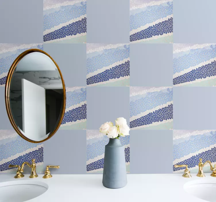 Transform your space with our Location sticker abstract patterned mosaic, a stunning design that features a captivating blend of blue tones and geometric shapes. The textured design mimics the allure of tiles and mosaics, bringing a wave of elegance to your interior style. Each element seamlessly combines to create a visually striking piece that draws the eye and enhances any environment!