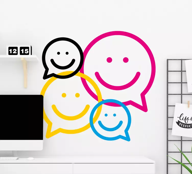 Reference: A49042A playful arrangement of smiley faces in varying sizes and colors represents joy and communication. These cheerful icons, stylized with speech bubbles, evoke emotions and create a lively atmosphere, perfect for spaces that aim to inspire positivity.