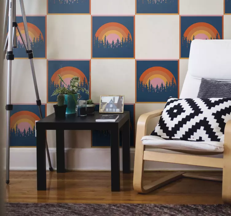 Transform your space with our stunning Location sticker sunset forest landscape! This beautiful design features a breathtaking sunset draped over a serene forest, showcasing vibrant colors that bring nature's beauty indoors. The tile-inspired layout adds a modern touch, making it a perfect addition to any home or office decor.