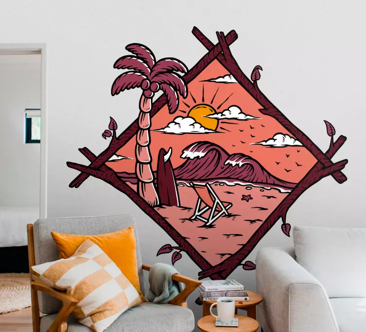 Transform your space with our stunning Nature wall sticker tropical beach scene. This exquisite design features a lonely surfer riding the waves against a breathtaking sunset. The scene is framed by graceful palm trees and a cozy beach chair, inviting you to relax and dream of tropical getaways. The distant mountains add a touch of adventure, making this drawing a perfect escape right in your home.