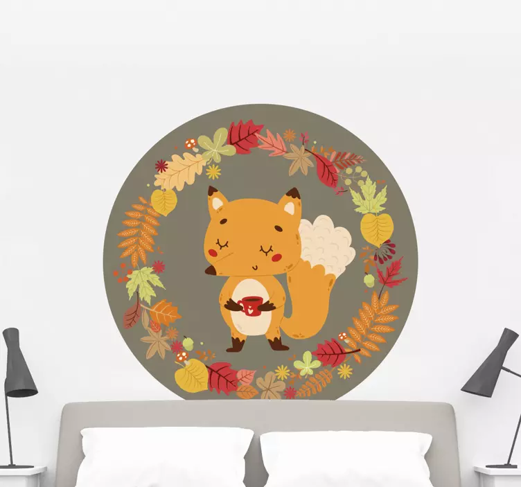 Reference: A46948A charming illustration featuring a fox character surrounded by colorful autumn leaves. The playful expression of the fox, holding a small object, adds a whimsical touch. This design captures the essence of the fall season, inviting warmth and cheer.