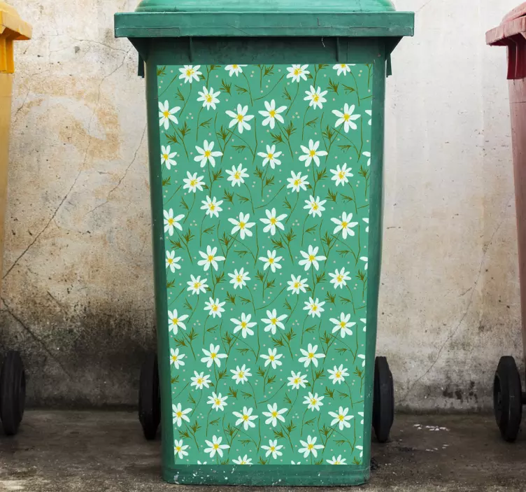 Introducing our stunning Recycling decal for bin floral pattern green, featuring a delightful illustration of daisies and vibrant floral patterns that bring the beauty of nature right to your waste container! This design captures the essence of greenery with its enchanting depiction of flowers, making recycling not just a responsibility but a joyful experience. The combination of a sleek container and a captivating floral illustration creates a perfect harmony of style and function.