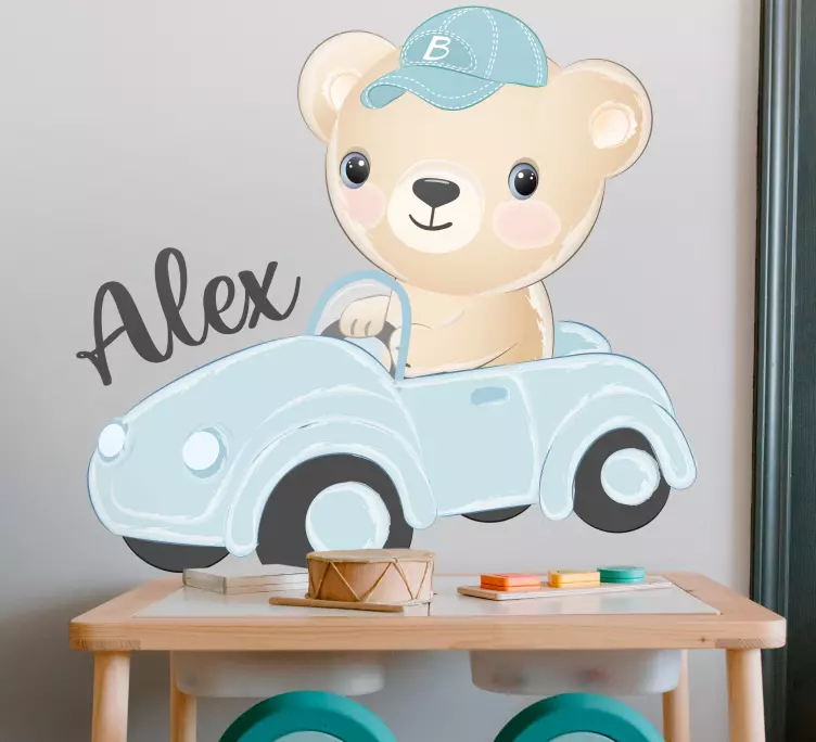 Bring a touch of playfulness to your child's space with our Wall sticker cute bear driver. This enchanting design features a delightful teddy bear behind the wheel of a charming cartoon car, creating an inviting atmosphere that's both cute and whimsical. Personalize it with your child's name for an extra special touch! The cheerful bear and vehicle design perfectly embodies a children's theme, making it an ideal choice for any playful environment.