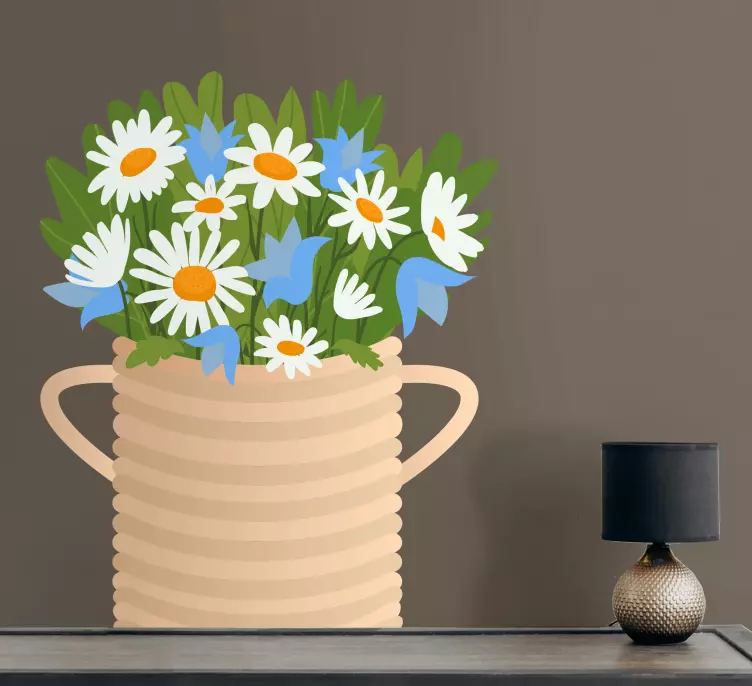 Transform your space with our stunning Wall sticker floral arrangement vase! This design captures the essence of nature with a beautiful vase adorned with vibrant flowers, including cheerful daisies, delicate blue petals, and lush green leaves. It's a perfect way to bring the outdoors inside, creating a lively atmosphere in any room.