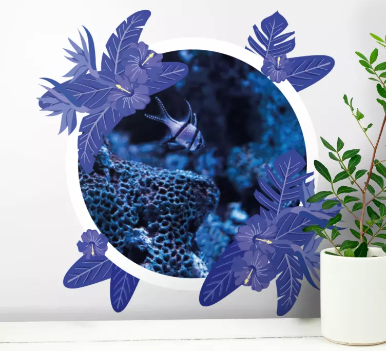 Immerse yourself in the enchanting world of the ocean with our Wall sticker frame underwater exploration scene. This captivating design features a harmonious blend of florals and tropical elements, creating a stunning portrayal of coral reefs and vibrant fish. The round frame is adorned with nature-inspired leaves in shades of blue, inviting you to explore the beauty of underwater life from the comfort of your space.