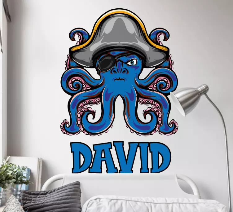 Transform your space with our Wall sticker pirate octopus character! This whimsical design features a charming octopus dressed as a pirate, complete with a customizable name that adds a personal touch. The illustration is predominantly blue, bringing a vibrant splash of color to any room while sparking joy and imagination.