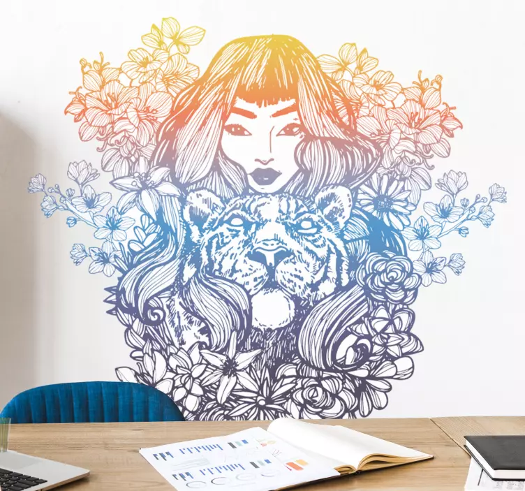 Introducing our stunning Wall sticker woman with tiger, a breathtaking design that beautifully intertwines the elements of celtic artistry with the fierce spirit of a woman and her majestic tiger. This captivating drawing showcases intricate line art surrounded by vibrant flowers and floral patterns, all rendered in striking bold colors and a mesmerizing gradient. It's the perfect statement piece for any space!