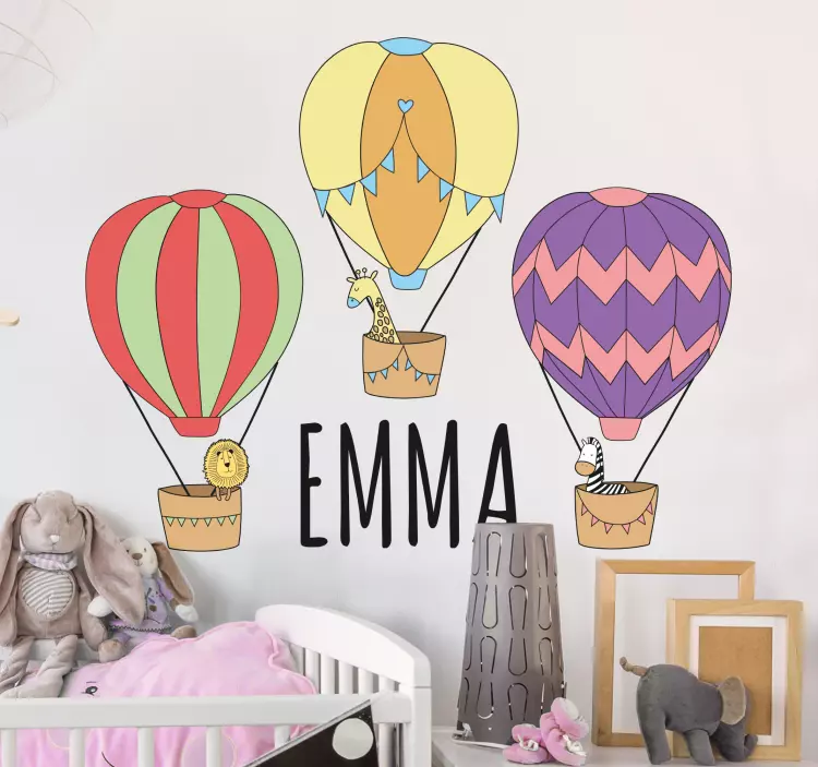 Transform your child's room into a vibrant world of imagination with our Wall stickers for kid lively hot air balloons. Featuring delightful hot air balloons soaring high alongside playful animals, these customizable stickers add a touch of adventure to any kids room. Personalize it with a custom name to make it uniquely theirs! The enchanting illustration invites fun and creativity, making every day feel like a new journey.