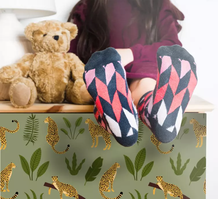Introducing our stunning Wild animal sticker leopard print jungle, a vibrant depiction of the wild that captures the essence of nature! This unique design features leopards nestled among lush leaves and rich tropical patterns, bringing the beauty of the jungle into your home. With its striking wildlife motifs and an exquisite blend of green and floral elements, this surface decoration is perfect for adding an adventurous touch to any room.