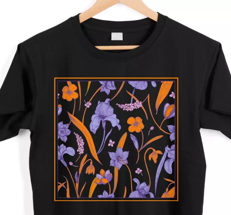 Introducing our Floral pattern elegance t-shirt, a stunning piece that beautifully captures the essence of nature. This graphic design features a vibrant illustration of crocus and other colorful flowers, blending shades of orange and purple to create a lively floral artwork. With its intricate details, this t-shirt celebrates flowering plants and the beauty of nature, making it a perfect addition to your wardrobe.