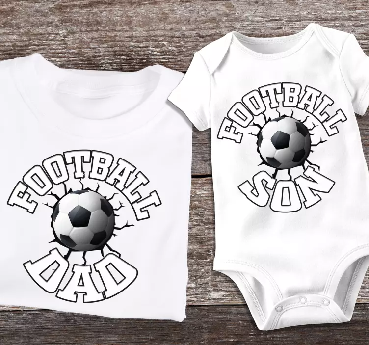 The design is a father and son football expression. It illustrates a soccer ball against a cracked wall, captioned with text. The text reads 'Football Son' and 'Football Dad' respectively.