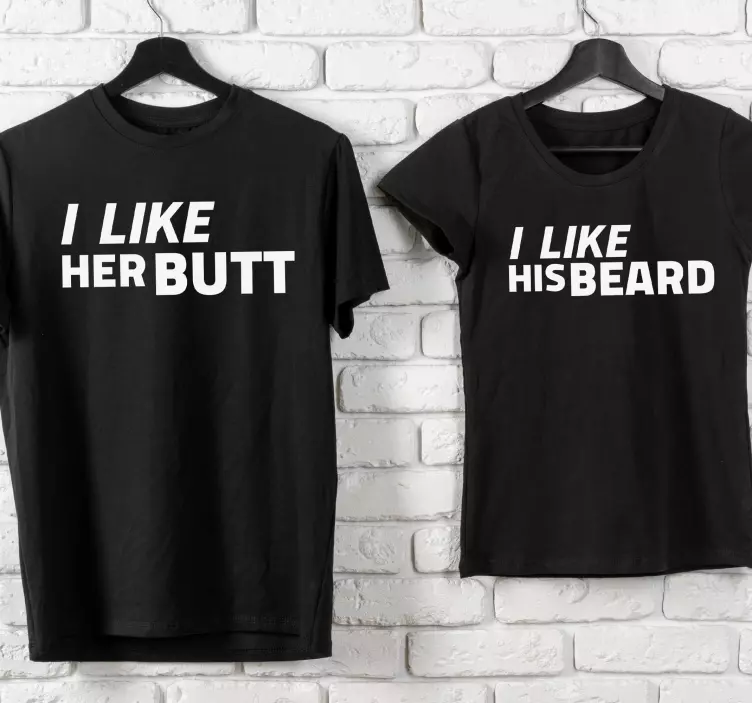 Show your love for each other with a touch of humor and corniness with these funny matching t-shirts. Available in black, these shirts feature the text 'I like her butt' and 'I like his beard'. Choose from a variety of colors to find the perfect match for you and your partner. Add these matching shirts to your cart now to complete your couple look!