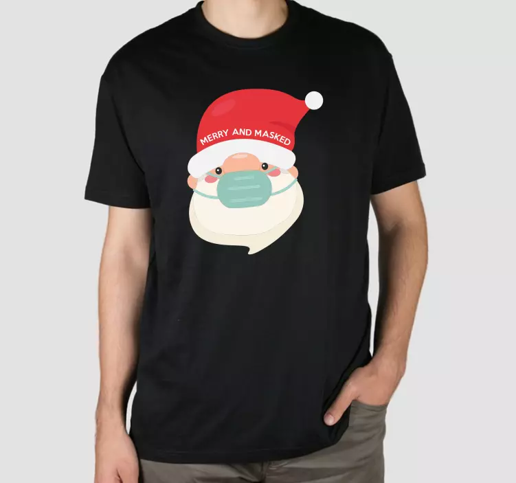 This design features a cartoon Santa face with hat and beard, wearing a light blue face mask. With a range of different options to choose from, this shirt is the perfect addition to your holiday wardrobe. Stand out from the crowd and spread some holiday cheer with this fun and festive tee.