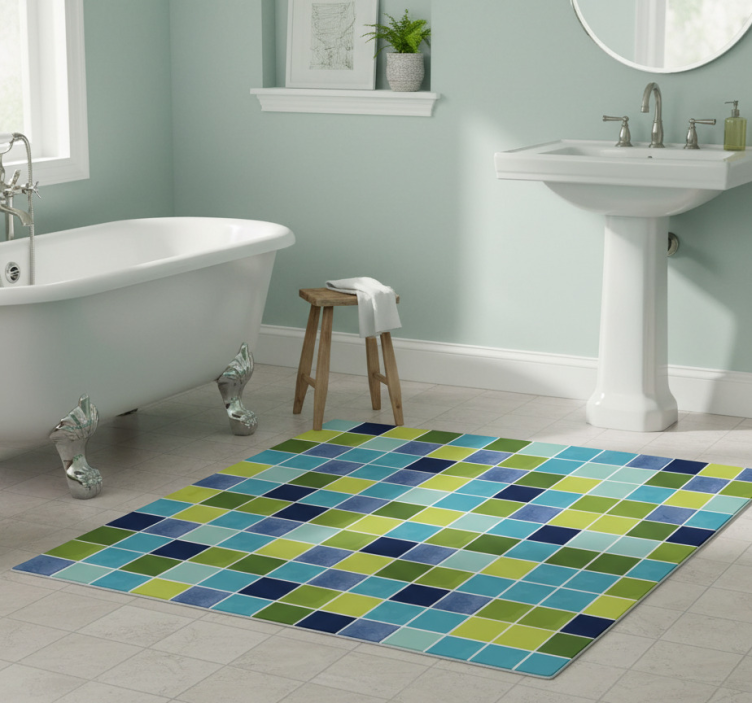 Blue and green tiles bathroom vinyl rug