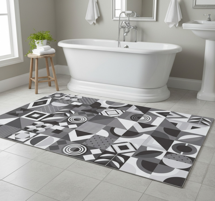 Bathroom vinyl rug in gray geometric tiles