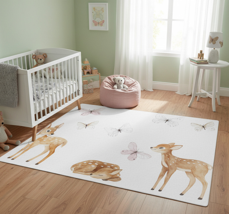 Reference: R24036Transform your space with our stunning Bedroom vinyl rug featuring little deer and butterflies! This delightful design brings the magic of nature indoors with charming little deer playfully frolicking among vibrant butterflies. The whimsical colors and intricate patterns create a cheerful atmosphere, making it the perfect addition to elevate your bedroom decor!