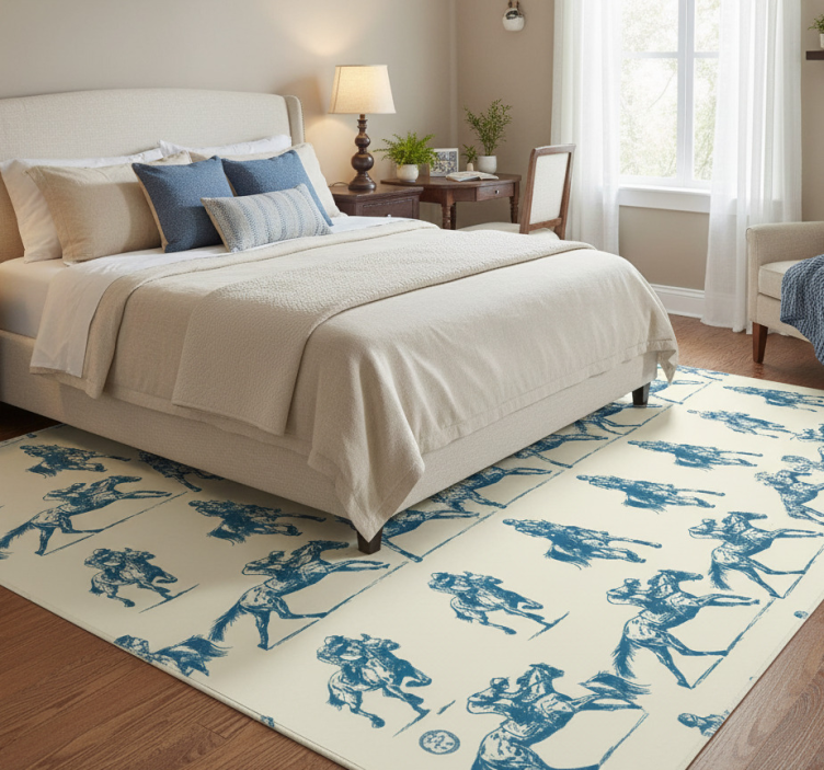 The Bedroom vinyl rug with blue and beige horse design bedroom vinyl rug is more than just a floor covering; it’s a statement piece! This rug invites you to express your love for equestrian themes while effortlessly tying together your room's aesthetic. Imagine waking up to the serene elegance it brings, making your bedroom a sanctuary of style and comfort!
