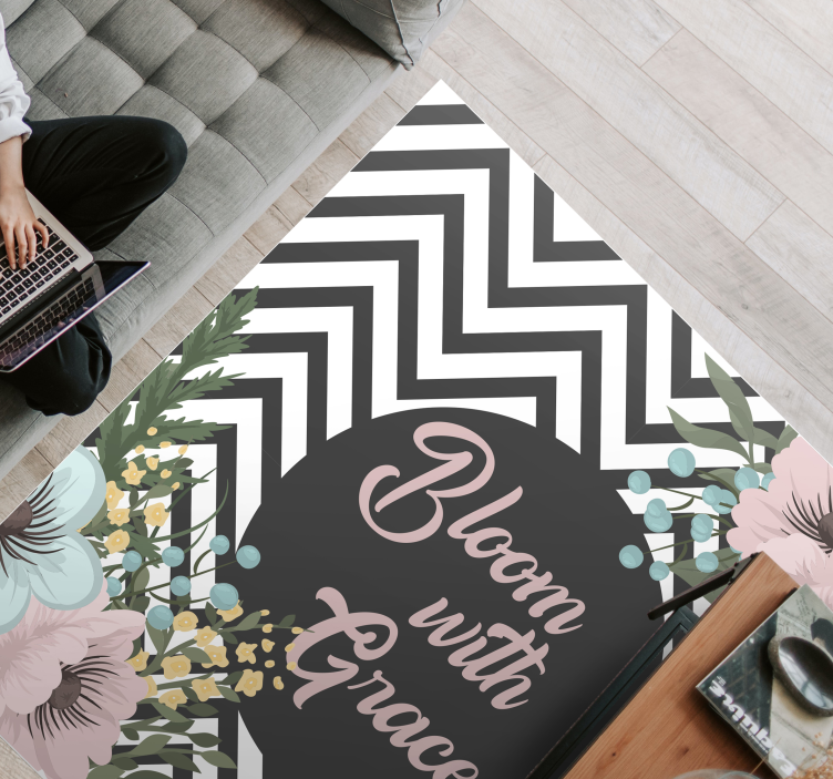 Elevate your home decor with our Bloom with Grace custom rug. This beautiful bespoke floor carpet boasts a lovely design and text inscription that will add charm to any space in your house.